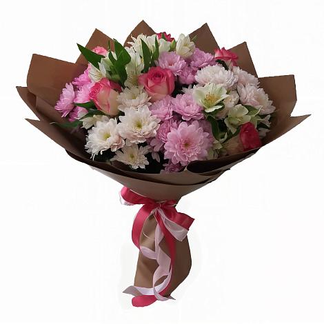 Букет "Розовое очарование" воплощает в себе свежесть и чистоту нового дня. Нежные розовые розы, пушистые астры и хризантемы оттеняют белоснежные альстромерии и зелень, создавая гармонию и легкость. Этот букет отлично подойдёт для подарка любимым, коллегам или близким, чтобы выразить самые светлые чувства и наполнить день тёплыми эмоциями.